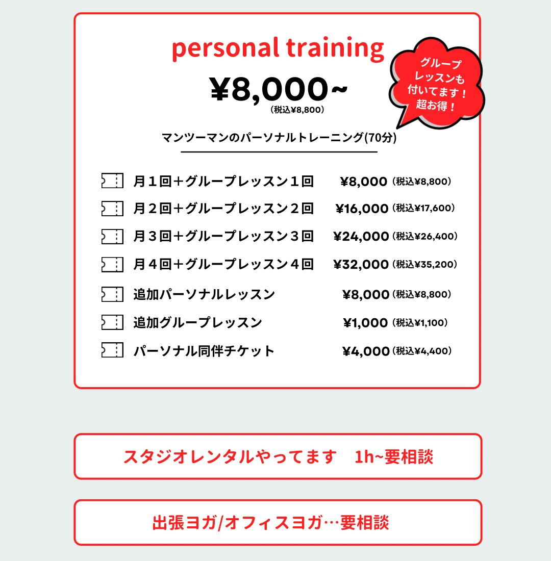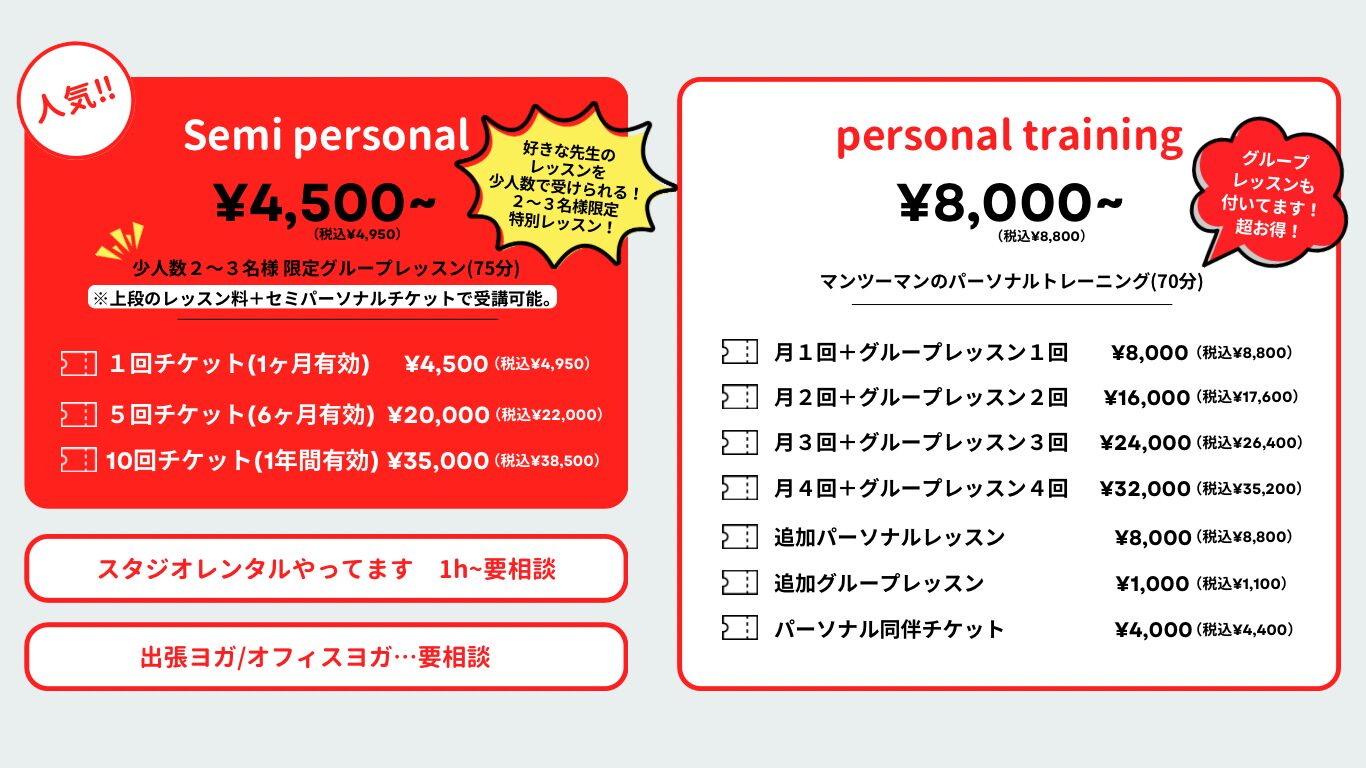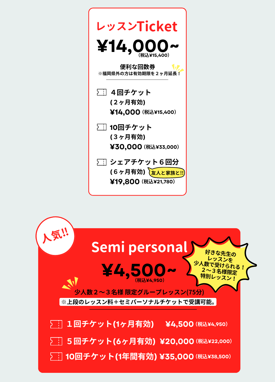 ※4回・10回チケット及び、セミパーソナルチケットは有効期限を過ぎると未消化分は全て無効となります。繰越なし。